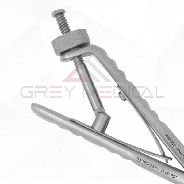 GreyMedical® A Angular Ulrich Bone Clamp with Speed Lock 5 1/4″(5.25cm) specialist orthopedic tool, the Ulrich Bone Clamp with Speed Lock is about 5 1/4″ (130-133 mm) long and is used to grasp and manipulate tiny bones, bone fragments, or tissues during surgical reduction and fixation. it is crafted from premium surgical-grade stainless steel, featuring a satin finish that ensures the best possible quality.