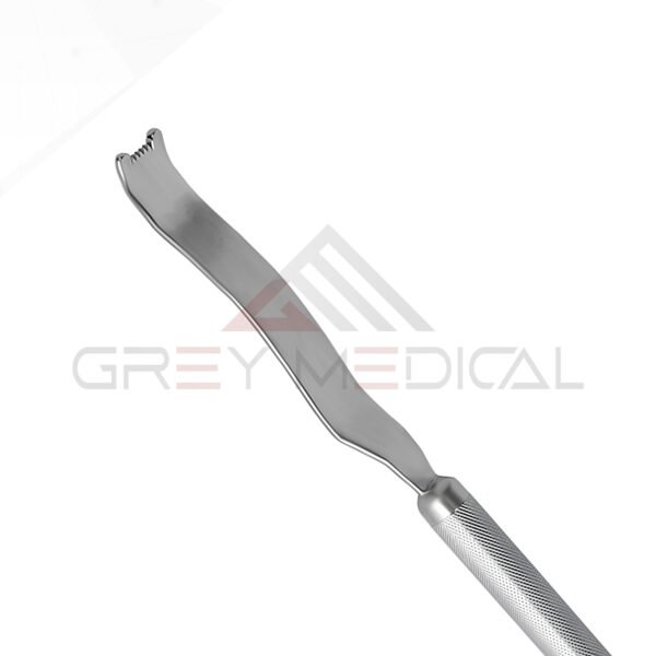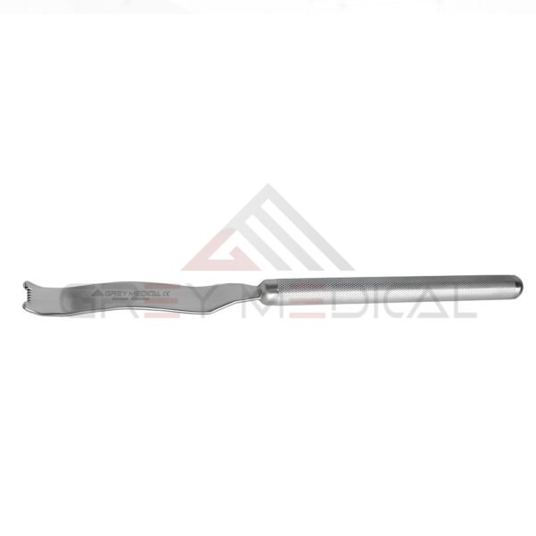 GreyMedicalĀ® Introduces the Femoral Neck Elevator – Knurled Handle, utilized during pelvic and hip surgeries. It is mostly used to elevate and retract the femoral neck, giving surgeons better access and visibility when performing reconstructive, trauma treatment, and joint replacement procedures. The tool comes in four sizes—70 mm, 31 mm, 56 mm, and 38 mm—and features a femoral neck curved blade with a tiny serration on its narrow tip for delicate dissection. It has a knurled grip for precise and ergonomic handling. It is manufactured according to International Standards of Medical Hygiene and constructed with German Stainless Steel for long-lasting use.