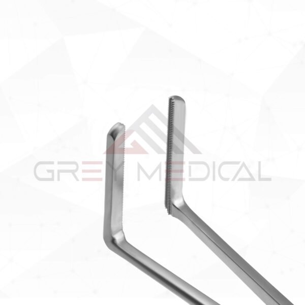 GreyMedical® Introducing the Hayes Anterior Resection Clamps (25cm, 26.5cm) are surgical instruments that are used during anterior resections to fix and retard tissue, ensuring the rectal stump and surrounding tissue remain firmly held, allowing for better suture or staple formation. They are 70-degree angled, have 1 x 2 DeBakey Jaws and angular shafts. Hayes Anterior Resection Clamps are easy to clean and can be reused in clinical settings. In addition to that, it is crafted from premium surgical-grade stainless steel, featuring a satin finish that provides the best possible quality.