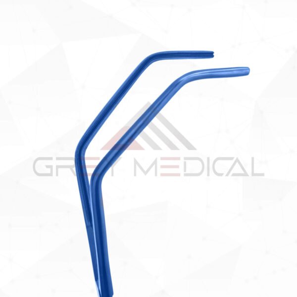 GreyMedicalĀ® Introduce Satinsky Clamp Angled DeBakey Atraumatic jaws, Curved Shanks, Titanium 10” (25cm) utilized by surgeons, particularly in cardiovascular surgery, to partially block the flow of blood in major blood arteries in order to facilitate their subsequent anastomosis. The clamps have crosshatched, double-angled jaws. Surgeons can grab large blood vessels like the aorta or the subclavian arteries thanks to the jaws’ atraumatic nature. The clamps’ long, thin shanks are useful for getting into tight spots. Additionally, the shanks join the finger rings to the boxlock. A useful ratchet mechanism for self-retaining retractions is included with the clamps.Its jaws are available in different sizes: 35mm angled,Ā  30mm angled, 24mm angled, and 18mm angled. It is Manufactured according to International Standards of Medical Hygiene and constructed with Titanium for long-lasting which is far stronger than stainless steel and ultra light-weight. They are marked with CE.