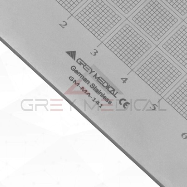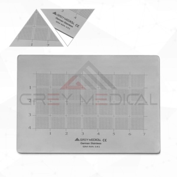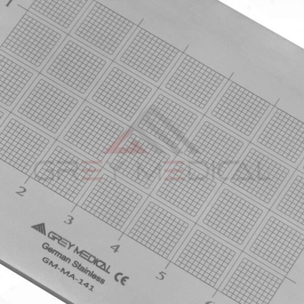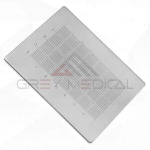 Sheen Cartilage Grid, 4” x 2-3/4” 10 cm x 7 cm, Aluminum For cutting, measuring, and photographing cartilage grafts. Measured in millimeters. Can be used as a cutting surface. Ideal for cutting, measuring, and photographing cartilage grafts. Graduated in millimeters with bold centimeter markings. cartilage grids, crusher grids, cartilage cutting grids, measuring grids.