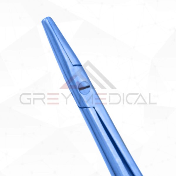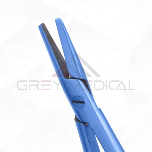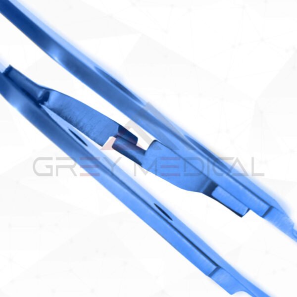 Titanium Bayonet-Style Micro Needle Holder undefined The titanium bayonet-style micro needle holder is compatible with suture sizes 6-0 and smaller and is intended for use in cardiothoracic operations when the surgical area is crowded with obstacles and precision handling is required. The flat grip and bayonet design of this weapon combine to offer optimal stability. The jaws’ increased grip and wear resistance come from being treated with a fine tungsten carbide dust. The non-magnetic, blue anodized titanium construction of this needle holder makes it stronger, lighter, and non-magnetic.